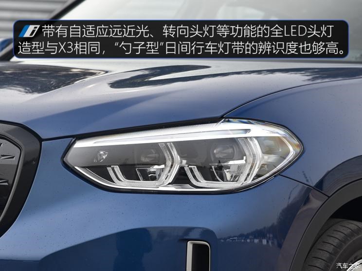 在燃油版X3上,豪华套装和运动套装车型的前包围两侧均设有大尺寸进气口装饰,相比之下,iX3前包围两侧通风口的造型看起来显得很含蓄,也符合纯电动车的身份。至于头灯,虽然造型没什么新鲜的,但像自适应远近光、转向头灯这些功能都是全系标配的,很实用。