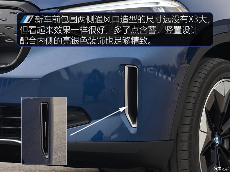 iX3外观依然延续了我们很熟悉的这套设计,确实一眼看过去没有太多新鲜感,但好在X3原有的这套造型看起来还是挺大气的,而且iX3融入一些新能源特征后的视觉效果也不别扭;今天我们来简单回顾一下这辆新车在外观设计上所采用的新元素。