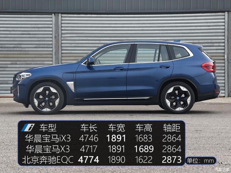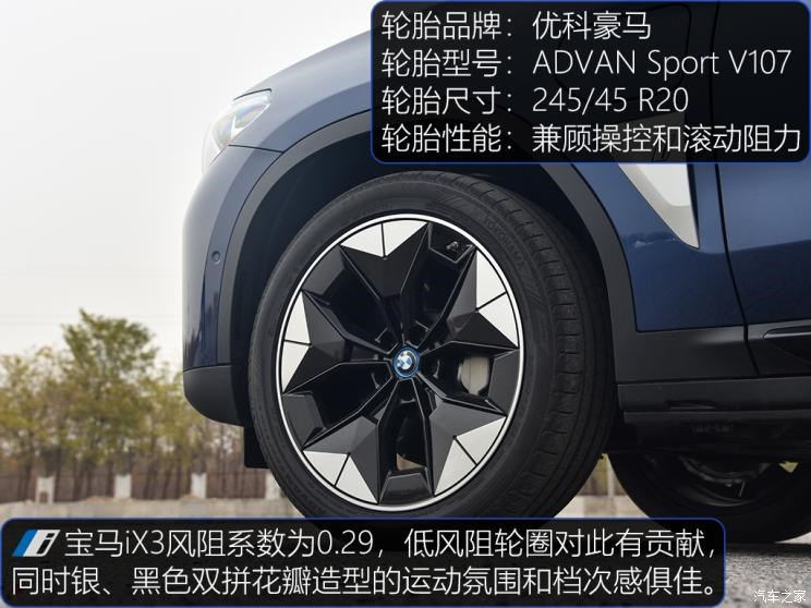 iX3车侧线条还是那么硬朗,在车身尺寸上,新车比X3稍大,但与同样定位为纯电动中型SUV的北京奔驰EQC相比,iX3还是要小一圈。在车侧,低风阻造型的轮圈很吸引眼球,兼顾运动氛围的基础上,这套轮圈配在该车上也显得很典雅。