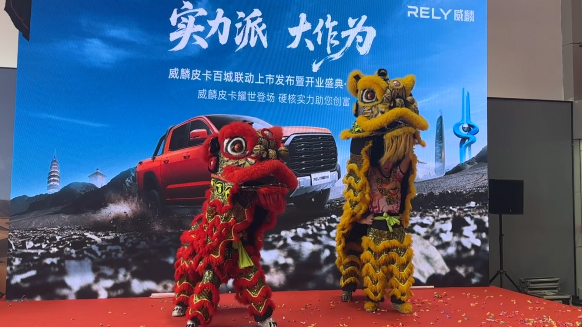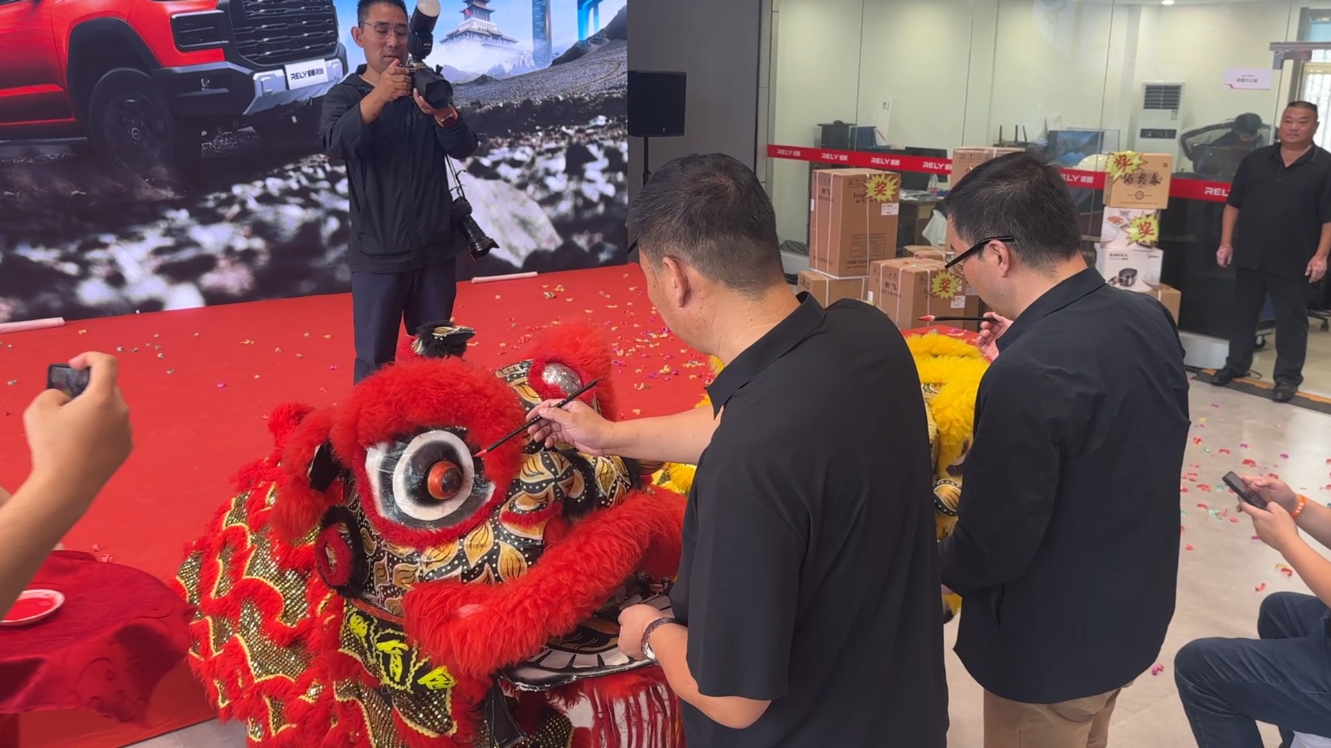 活动伊始,一场精彩绝伦的传统舞狮表演瞬间点燃了现场气氛。在这热烈的氛围中,RELY威麟皮卡品牌事业部总经理张佳明与济南首晟汽车销售有限公司投资人于月磊手持朱砂笔,为可爱的狮子点上炯炯有神的眼睛。仿佛在向世界宣告:济南首晟4S店正式开业,威麟品牌将在这片土地上开启新的辉煌征程!