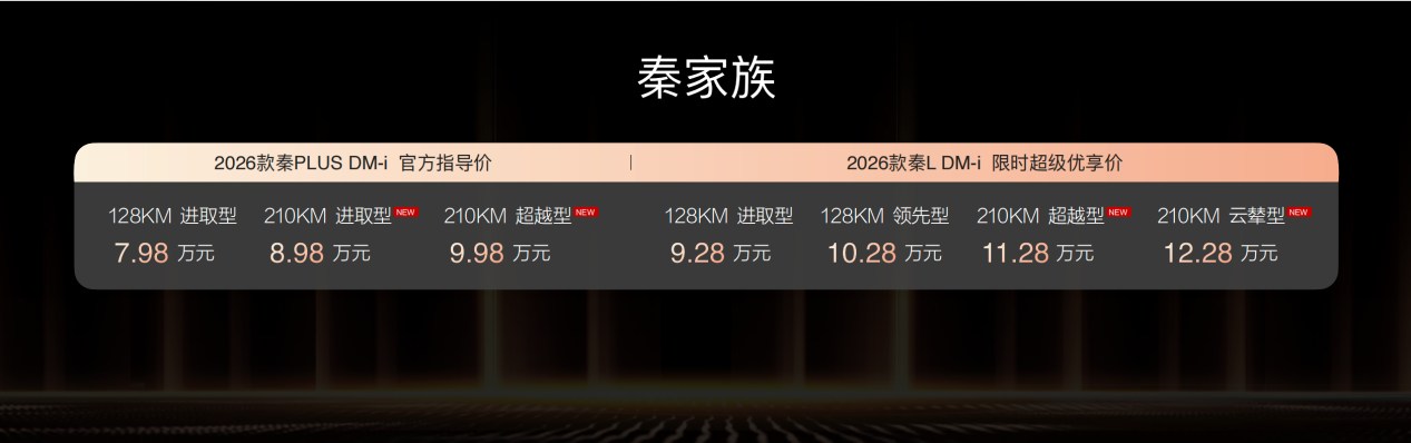 此次,2026款秦PLUS DM-i三款车型售价7.98万元-9.98万元;2026秦L DM-i四款车型限时超级优享价9.28万元-12.28万元;2026款宋Pro DM-i限时超级优享价9.98万元-12.78万元。