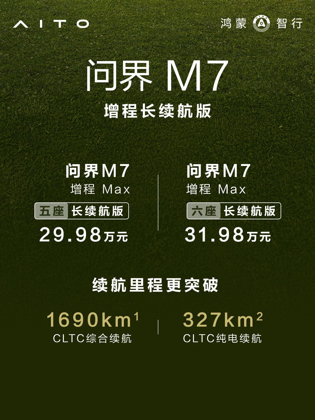 同日,全新问界M7增程长续航版正式上市,其中增程Max五座长续航版售价29.98万元,增程Max六座长续航版售价31.98万元,即刻下定,可享受至高60000元购车权益。