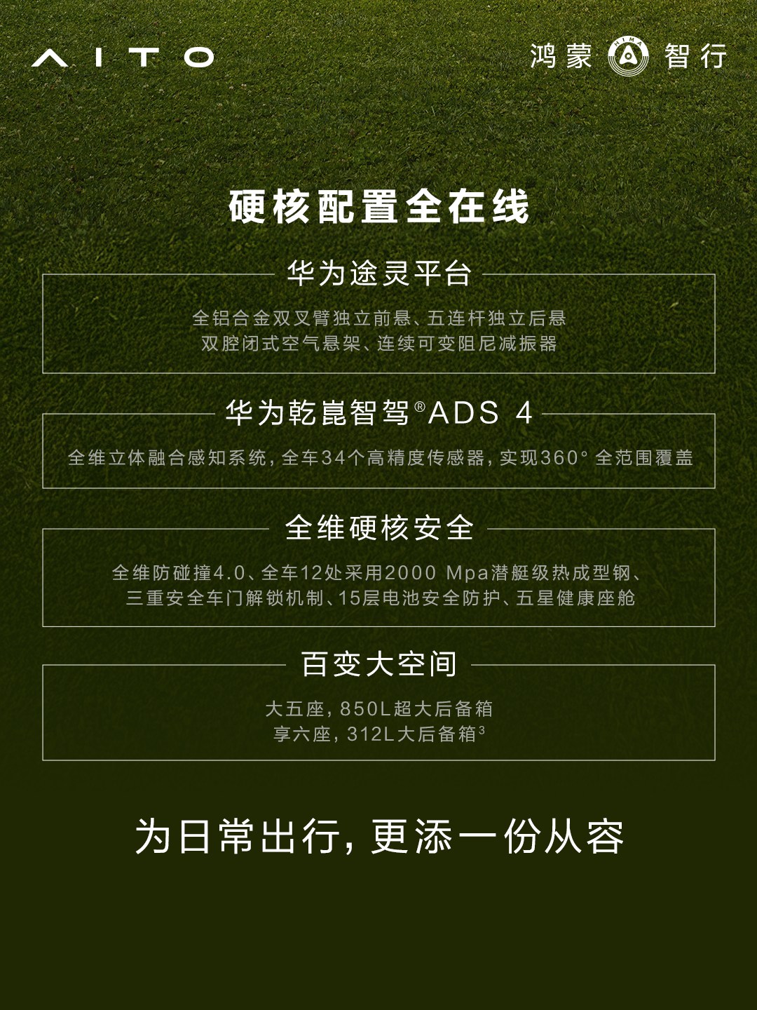 值得关注的是,全新问界M7增程长续航版悉数保留了在售车型的核心配置,硬核配置全面在线。华为途灵平台搭载全铝合金双叉臂独立前悬、五连杆独立后悬、双腔闭式空气悬架、连续可变阻尼减振器,兼顾舒适性与驾控质感;华为乾崑智驾ADS 4辅助驾驶系统配合34个感知硬件,可实现对动静态目标(含异形物体)的全场景和全天候感知,提升雨雾尘恶劣天气的安全性,以及对后向悬浮物、负向场景的识别,实现360度全覆盖;全维防碰撞4.0显著提升行车安全,全天候守护用户驾乘全程。