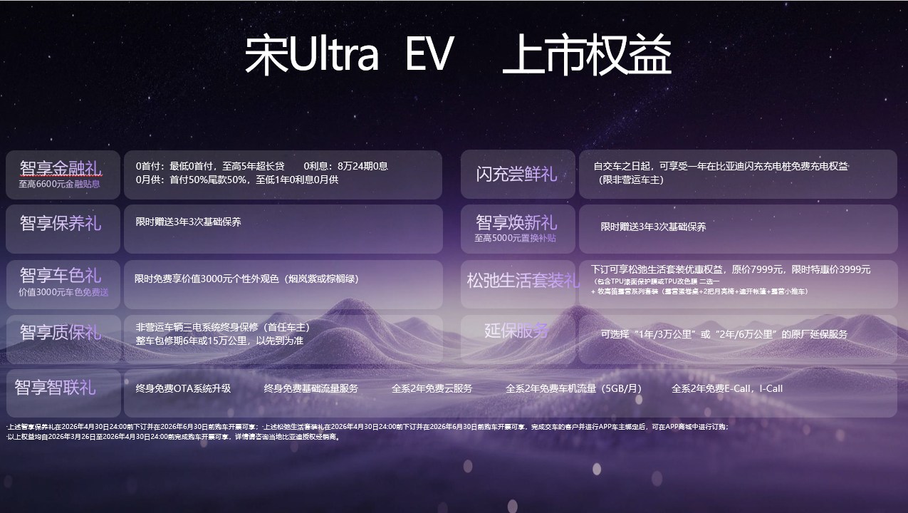 宋Ultra EV依托比亚迪第二代刀片电池与全域闪充技术,实现10%-70% SOC充电仅需5分钟,10%-97% SOC充电仅需9分钟,零下30℃极端环境下充电时间仅额外增加3分钟,补能响应更为迅捷,彻底打破纯电车型补能效率瓶颈;续航里程最高提升至710km,稳居同级别家用纯电SUV第一梯队;同时搭载天神之眼B-辅助驾驶激光版Dipilot300,搭配B级舒享大空间,在核心三电性能全面升级的基础上,完成了智能、舒适配置的全维度拉满。