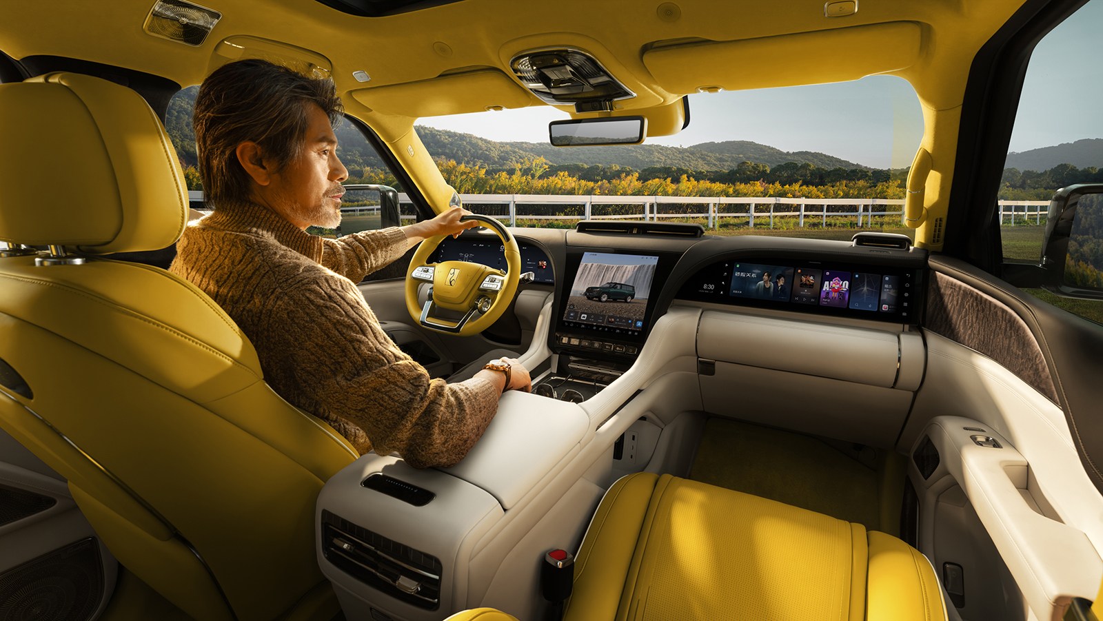 向外温润如玉,向内则心怀山河。U8L鼎藏版新增全新内饰配色“鸣沙金”,明亮的黄白拼色,宛如日出时敦煌鸣沙山和月牙泉的碰撞。座椅特别定制了山纹刺绣座椅,取形于“丝绸之路的生命线”——祁连山脉的轮廓,融入刺绣工艺书法笔墨意蕴。配合座舱前部飞流瀑布曲面屏设计,构筑出“前有江河奔涌,后有群山倚靠”的辽阔气势。