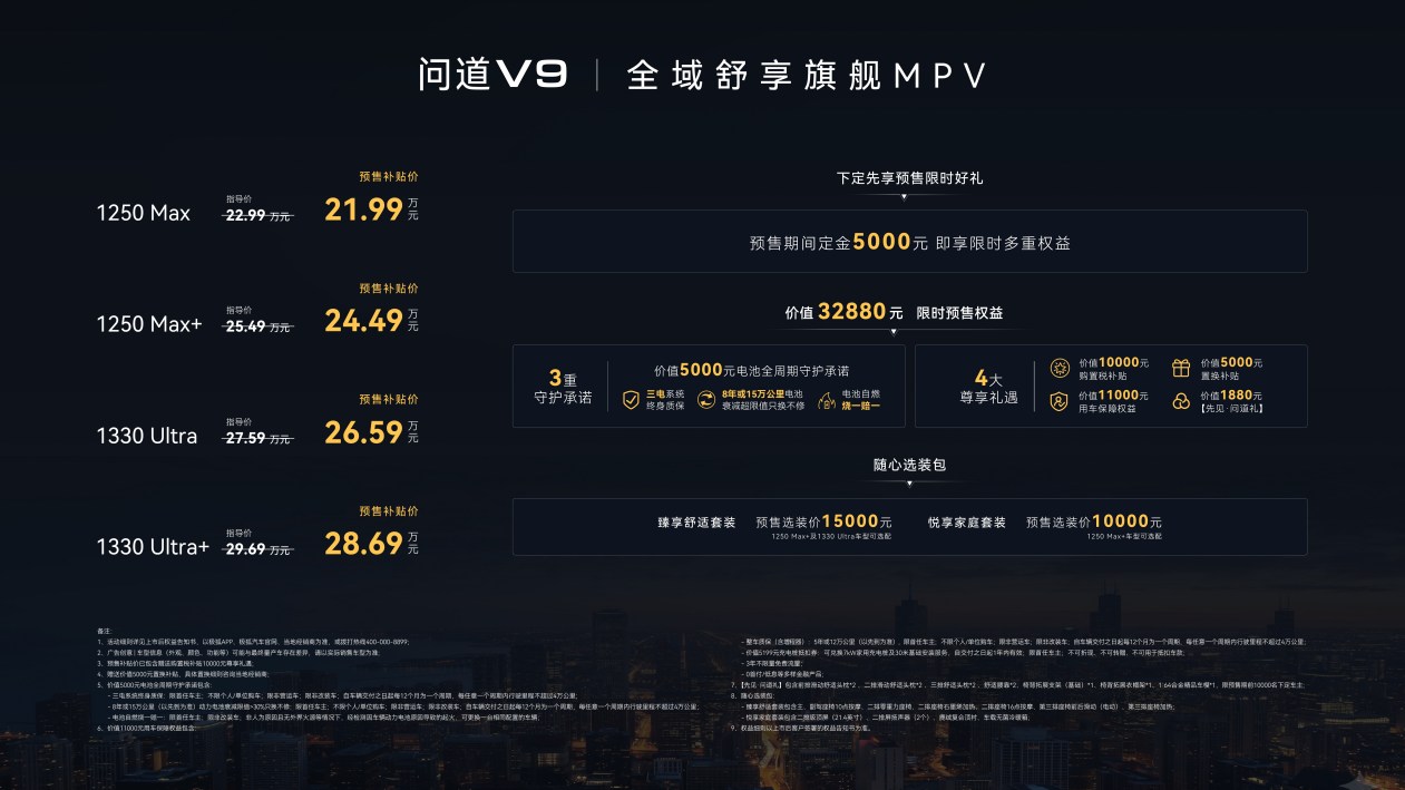 问到了!极狐问道V9真的来了,实力与诚意“夯爆”了。4月28日,极狐问道系列发布暨问道V9预售发布会盛大启幕,北汽极狐旗下首个高端产品系列“问道”正式面世,专为大型旗舰车型而生的泰岳平台同场发布。与此同时,作为泰岳平台赋能的“问道”系列首款产品,全域舒享旗舰MPV问道V9正式开启预售,共推出1250Max、1250Max 、1330Ultra、1330Ultra 共4款版型,预售补贴价21.99万元-28.69万元。凭借旗舰气场、旗舰底盘、旗舰舒享、旗舰安全、旗舰驾控、旗舰续航等十大旗舰价值与诚意满满的预售价格权益,极狐问道V9给用户带来50万级体验,成为旗舰MPV市场“夯爆”的高端出行新选择。
