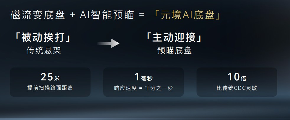 稳定性上,泰岳平台死磕技术工程,通过“磁流变底盘 AI智能预瞄”,打造元境AI底盘。区别于传统悬架的“被动挨打”,元境AI底盘实现“主动迎接”。摄像头和雷达会提前扫描车前方 25 米左右的路面,通过 AI 模型准确区分减速带、甚至道路接缝或碎裂凸起,传递到悬架,悬架里的磁流变液会在磁场激励下,在 1 毫秒的时间内改变硬度。在车轮轧上去之前,悬架就已经做好了准备。